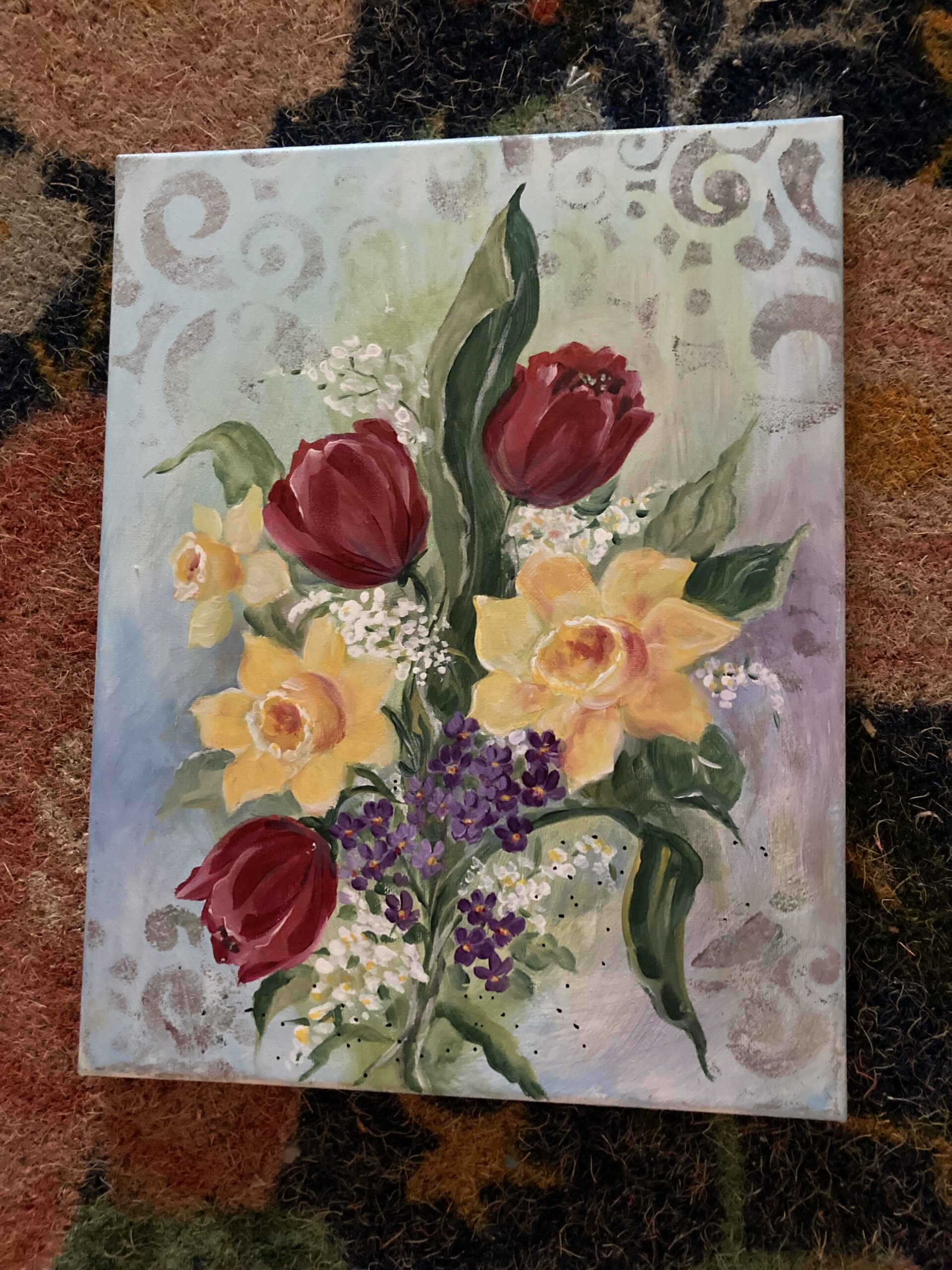 Flower painting class on 11x14 canvas with acrylic paints, markers, and stencils. All materials will be provided unless you would like to bring your own brushes.